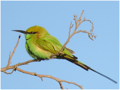 A late afternoon walk from the hotel through the nearby village gave us excellent views of Plum-headed Parakeets, Roller and Green Bee-eaters.