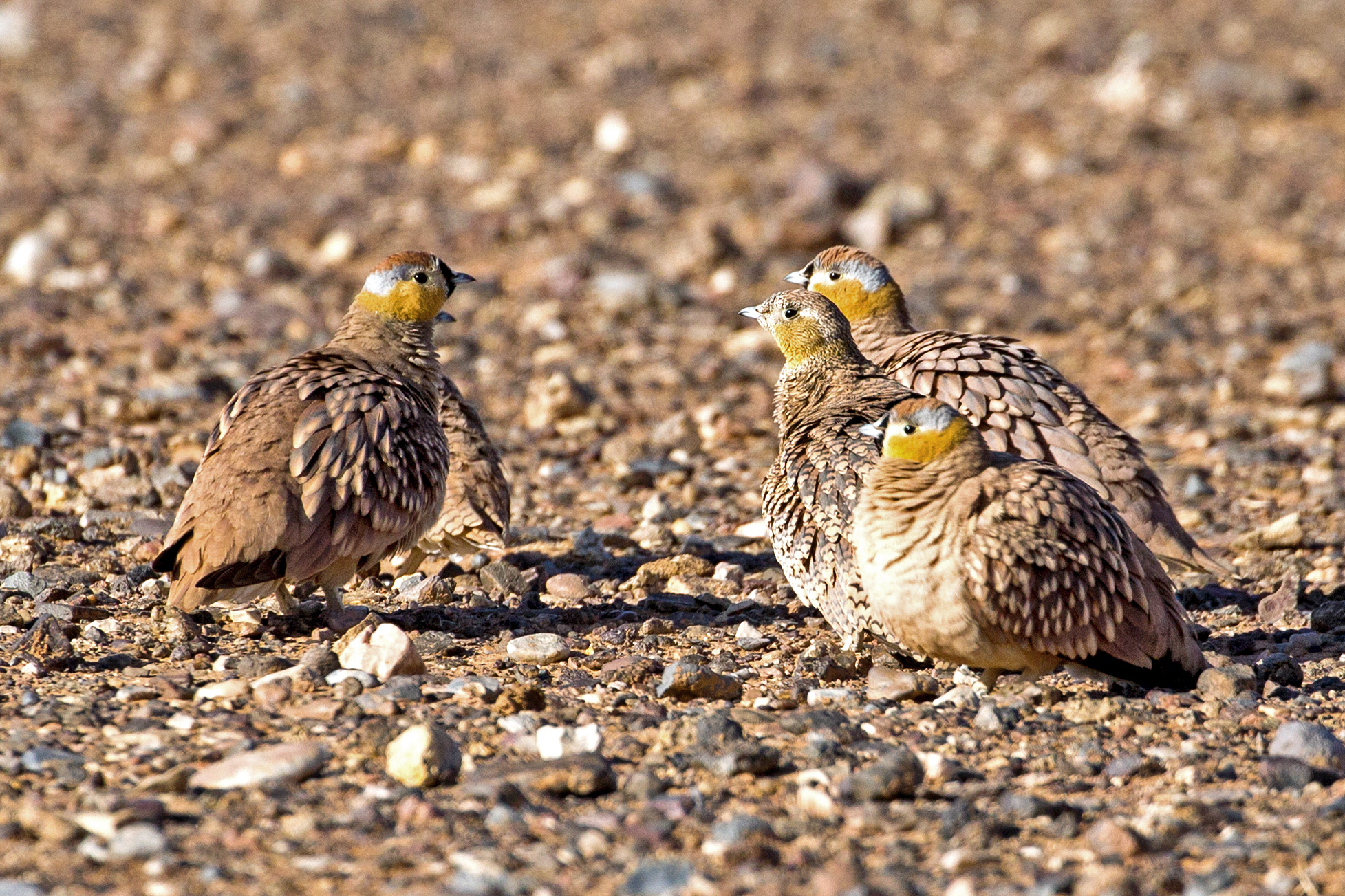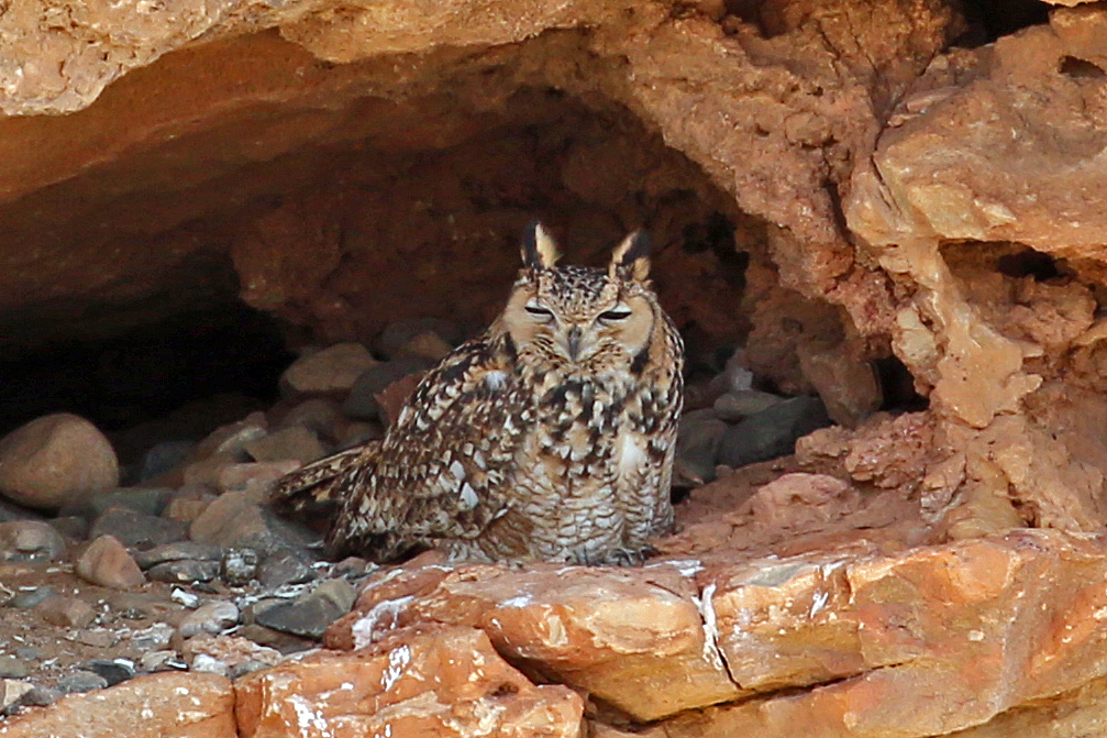 The next day we had a 4-wheel drive vehicle for our journey into the desert, which was particularly enjoyable as it was a comfortable 23/24 degrees C and the birding was excellent and the desert scenery impressive. Some of the more notable birds we saw were Spotted Sandgrouse, Crowned Sandgrouse, White-crowned Black Wheatear, Brown Necked Raven, Desert Sparrow, Bar-tailed Lark, Hoopoe Lark and Desert Warbler.