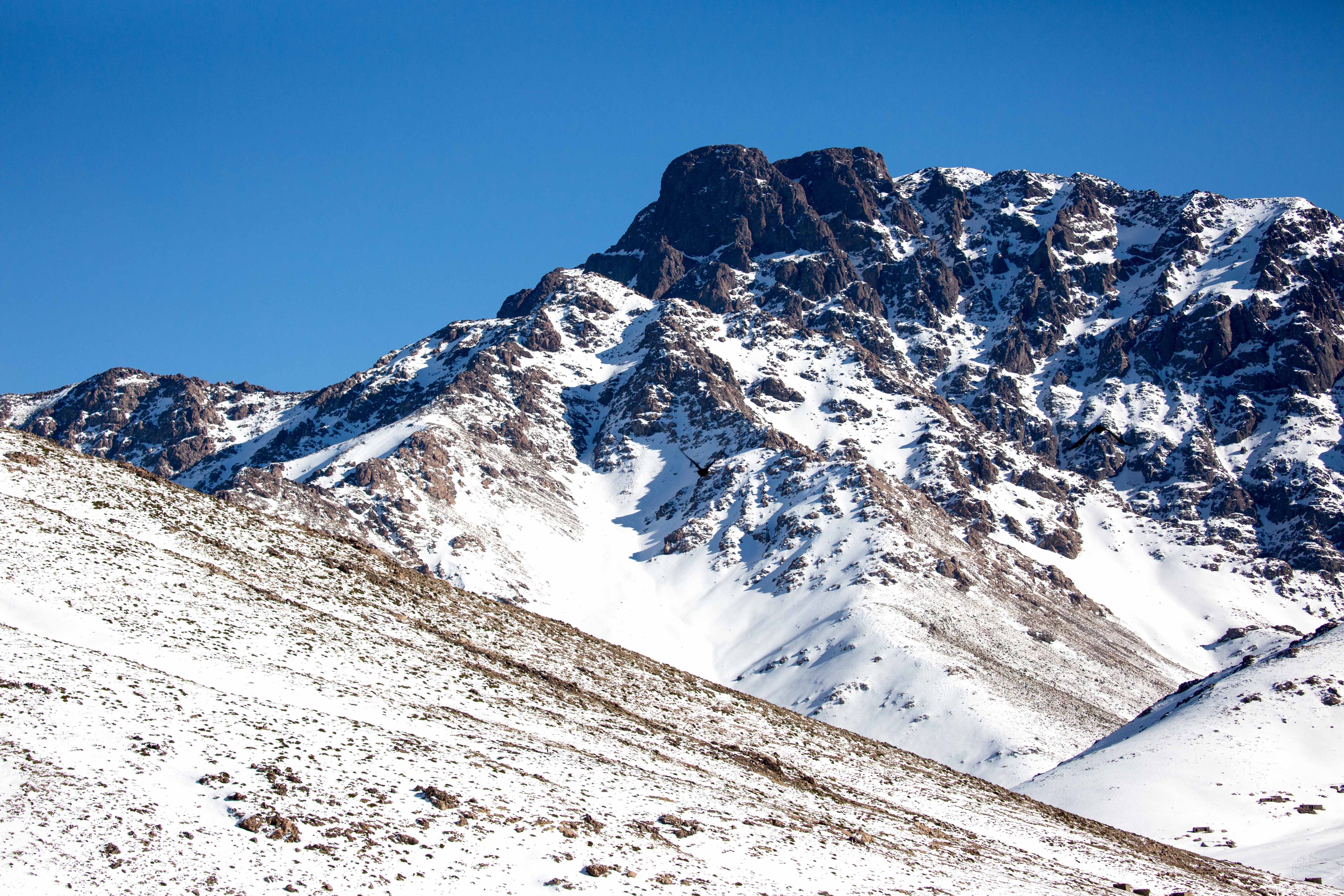 The next morning we were met at the Riad by our guide Brahim and set off towards the Atlas Mountains We made our first birding stop just outside Marrakesh and saw Moroccan Magpie, Long- Legged Buzzard, Little Ringed Plover (on passage). Then it was on to the ski resort of Oukaimeden where we had beautiful views of the mountains and saw some very nice birds including Crimson-winged Finch, Atlas-horned Lark, and Black Wheatear, Rock Bunting and a large mixed flock of Alpine- and Red-billed Choughs. We ate lunch, cooked outside, in glorious sunshine alongside a frozen lake.